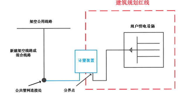 低压电力接入类项目:电力接入工程范围为计量箱至公共管网连接处的电力工程,以新上计量箱内电能表出线处为分界点,分界点电源侧供电设施属于电力接入工程范围,负荷侧受电设施由企业投资建设(不包含新建住宅小区、综合体项目中的用户)。示意图中蓝色部分代表电力接入工程范围,红色虚框代表建筑规划红线。