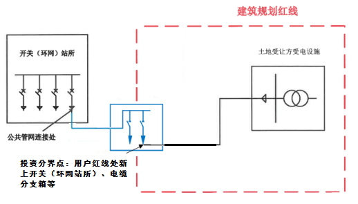 高压电缆接入类项目:电力接入工程范围为建筑规划红线内新上开关(环网)站所、电缆分支箱等至公共管网连接处的所有电力工程。以新上开关(环网)站所、电缆分支箱等出线总开关下端头搭接处为分界点,分界点电源侧供电设施属于电力接入工程范围,负荷侧受电设施由企业投资建设。示意图中蓝色部分代表电力接入工程范围,红色虚框代表建筑规划红线。